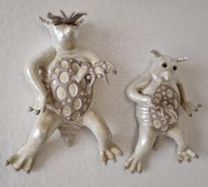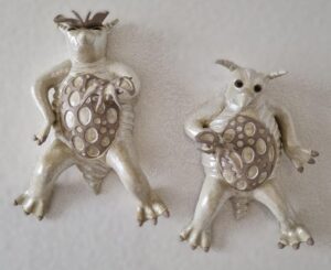 Delen in opbouw en delen uit mal. Werk is gemaakt van WMS 2005 GG klei. Afwerking is gedaan met glazuur en delen zijn onbewerkt gelaten.